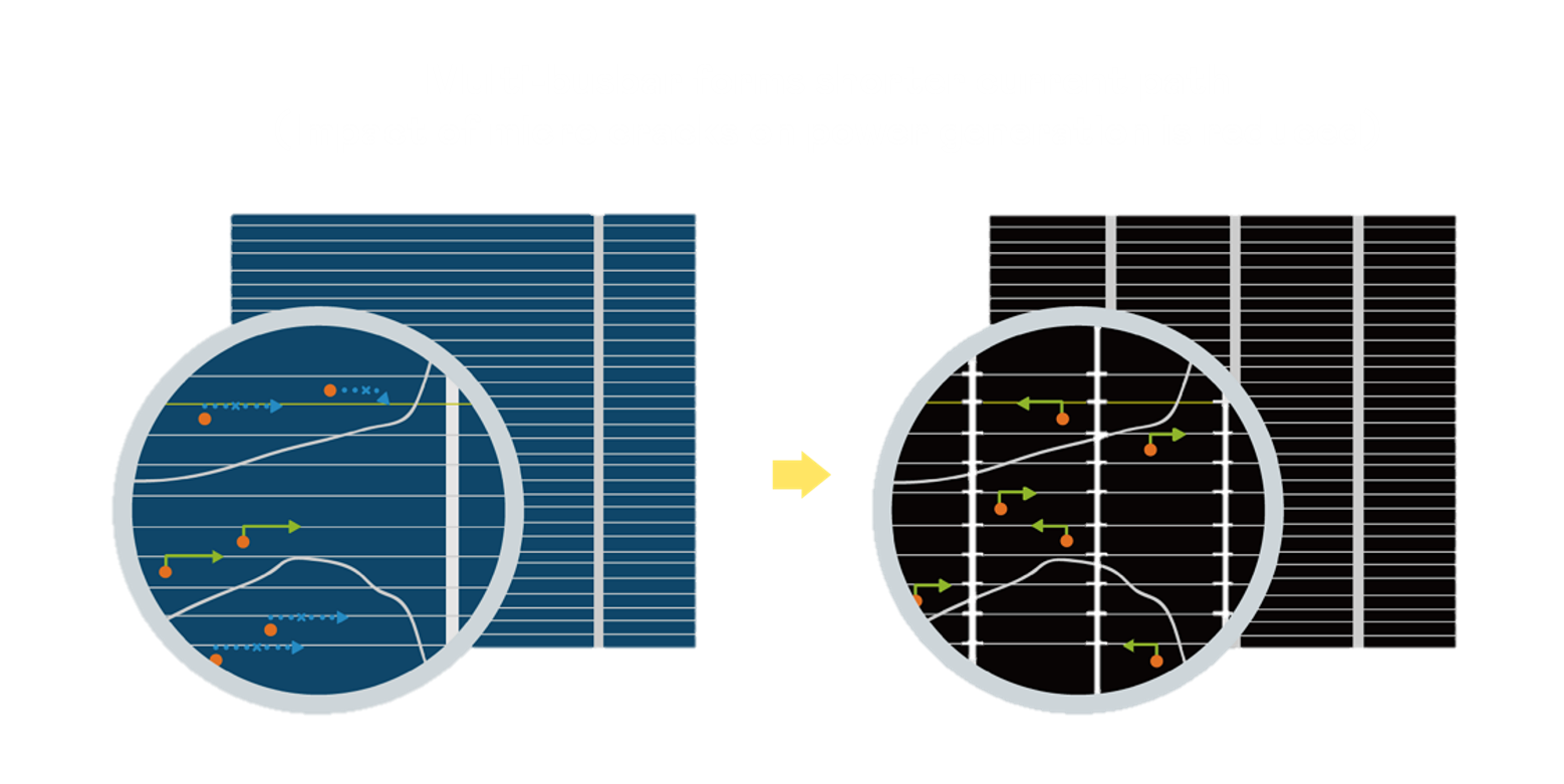 - 结合半切电池,降低遮阴影响、提升模组抗隐裂能力、并减少电阻损耗,进一步提升模组发电效能。